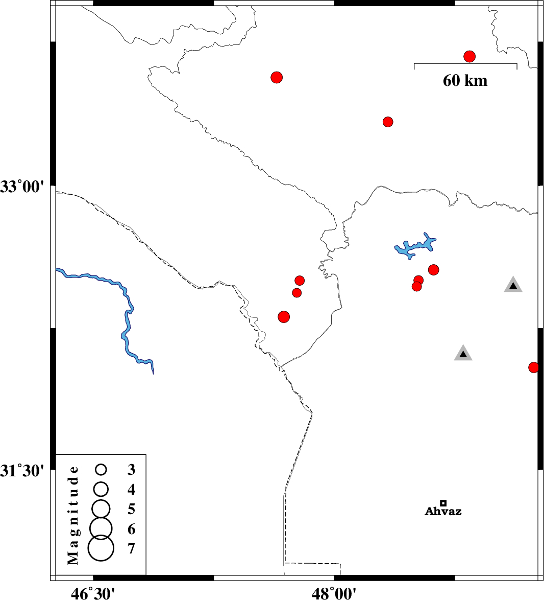 | 2017/08/31 | 09:32:52.7 | 14:02:52.7 | 32.309 | 47.685 | 15 | ML3.2 | Ilam Province, 54 km North-West of Shush | ||