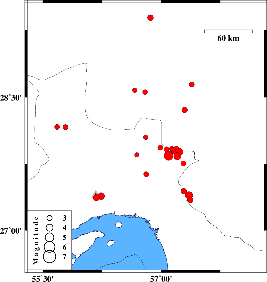| 2017/08/14 | 11:14:10.3 | 15:44:10.3 | 27.397 | 57.354 | 18 | ML4.2 | Kerman Province, 12 km -East of Dehbarez | ||