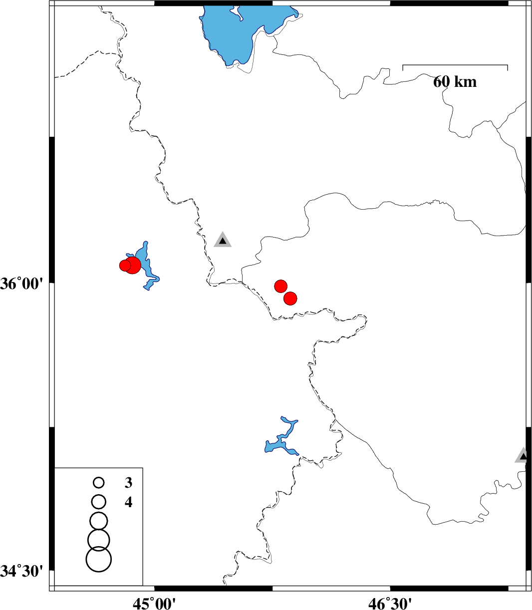 2017/08/30 | 11:32:23.5 | 16:02:23.5 | 35.918 | 45.863 | 14 | ML:3.8 | Kurdistan Province, 8 km of Baneh | ||