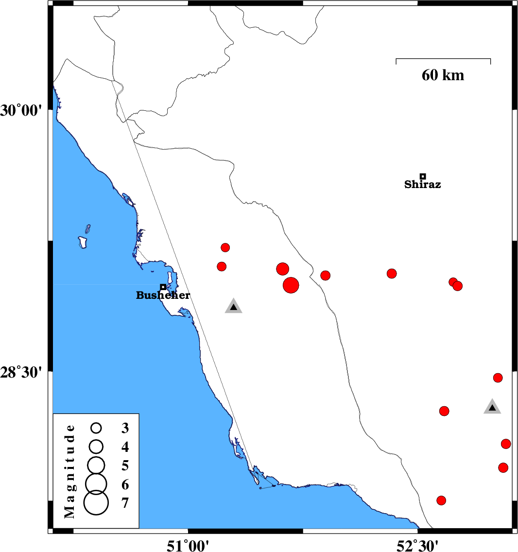 | 2017/08/19 | 11:32:42.4 | 16:02:42.4 | 29.103 | 51.219 | 15 | ML2.7 | Bushehr Province, 18 km South of Borazjan | ||
