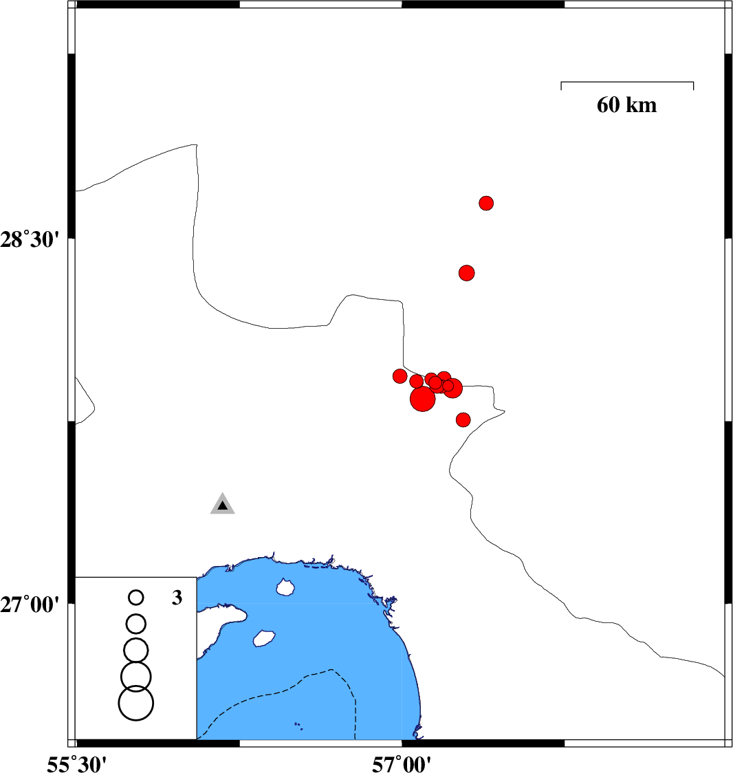 2017/08/31 | 02:29:07.1 | 06:59:07.1 | 27.923 | 57.134 | 15 | ML:2.7 | Kerman Province, 55 km -West of Kahnuj | ||