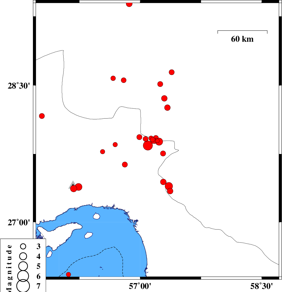 2017/08/16 | 01:54:41.7 | 06:24:41.7 | 27.37 | 56.178 | 14 | ML:3.6 | Hormozgan Province, 23 km North-West of Bandar-e abbas | ||
