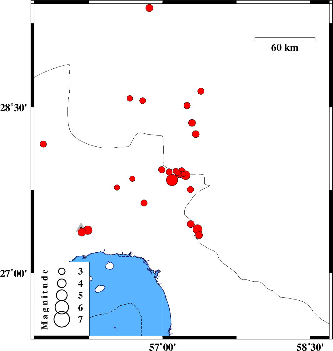 | 2017/08/14 | 11:14:10.3 | 15:44:10.3 | 27.397 | 57.354 | 18 | ML4.2 | Kerman Province, 12 km -East of Dehbarez | ||