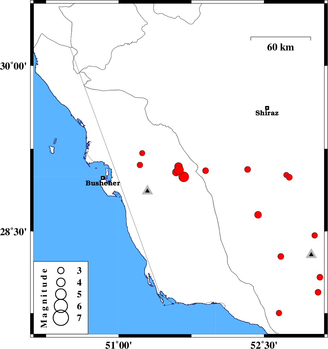 | 2017/08/19 | 11:32:42.4 | 16:02:42.4 | 29.103 | 51.219 | 15 | ML2.7 | Bushehr Province, 18 km South of Borazjan | ||
