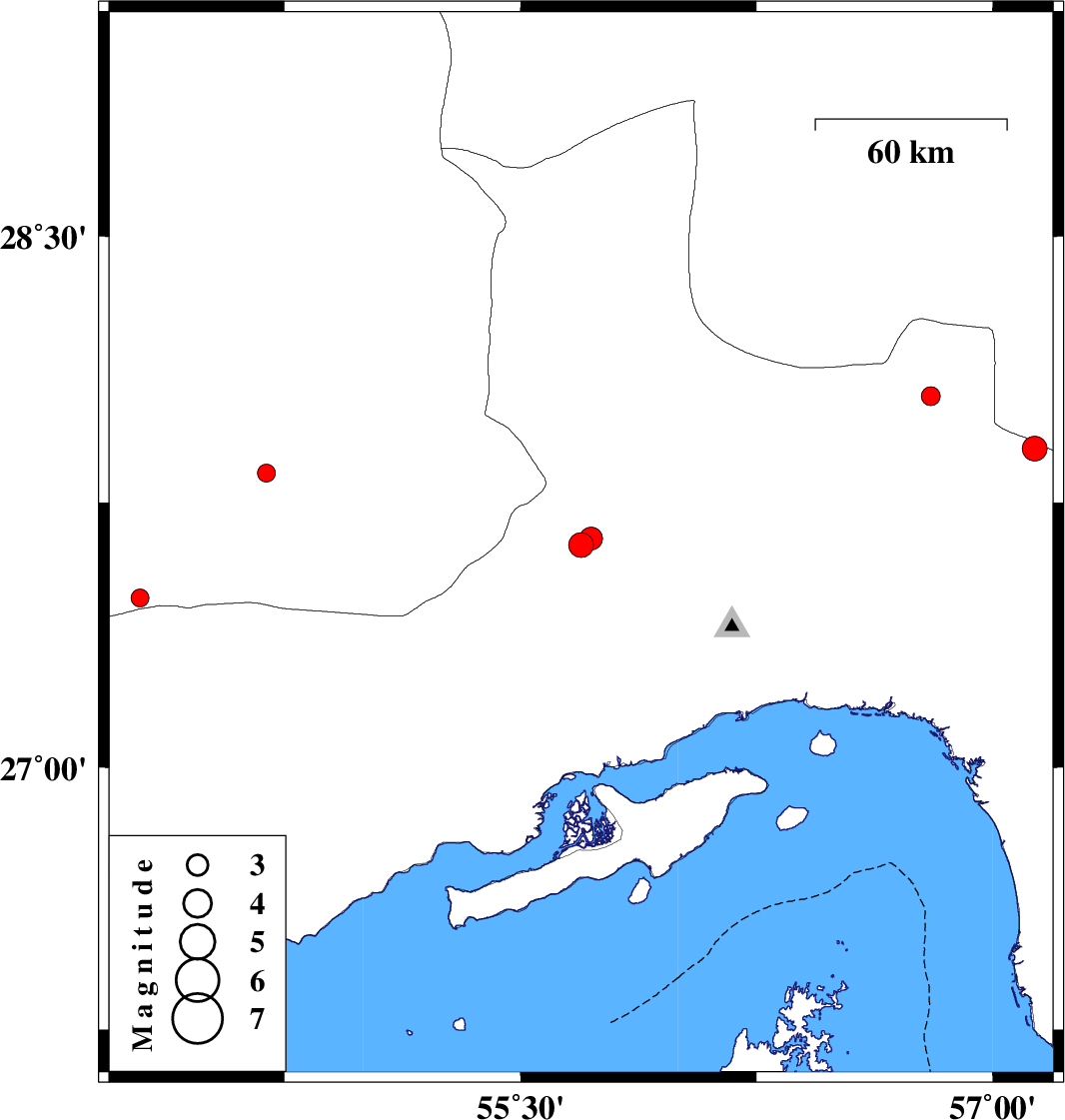 | 2017/09/02 | 20:47:52.8 | 01:17:52.8 | 27.834 | 54.692 | 15 | ML2.5 | Fars Province, 39 km North-East of Lar |