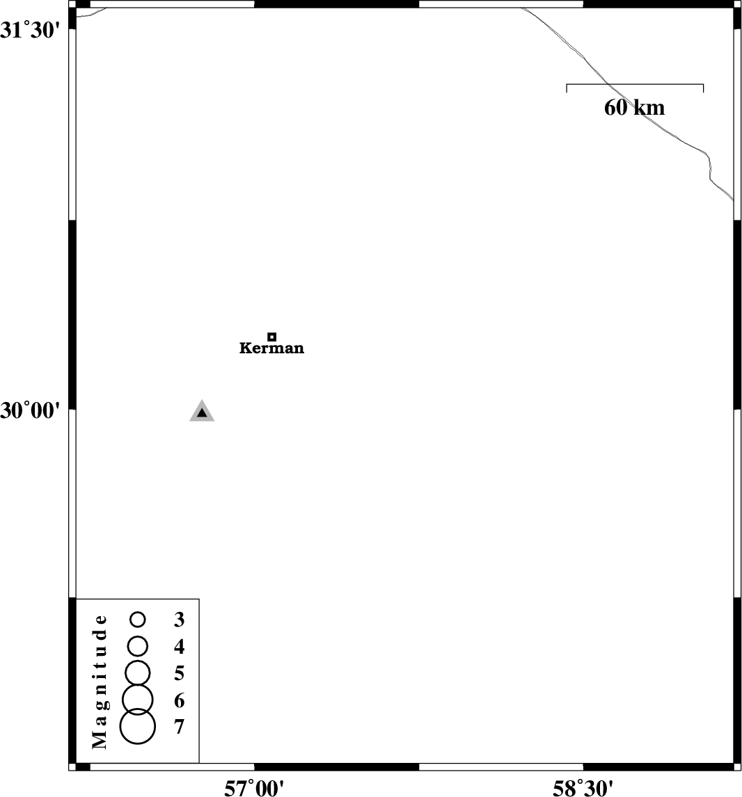 | 2017/09/10 | 23:53:51.3 | 04:23:51.3 | 30.084 | 57.685 | 6 | ML3.6 | Kerman Province, 63 km South-East of Kerman |