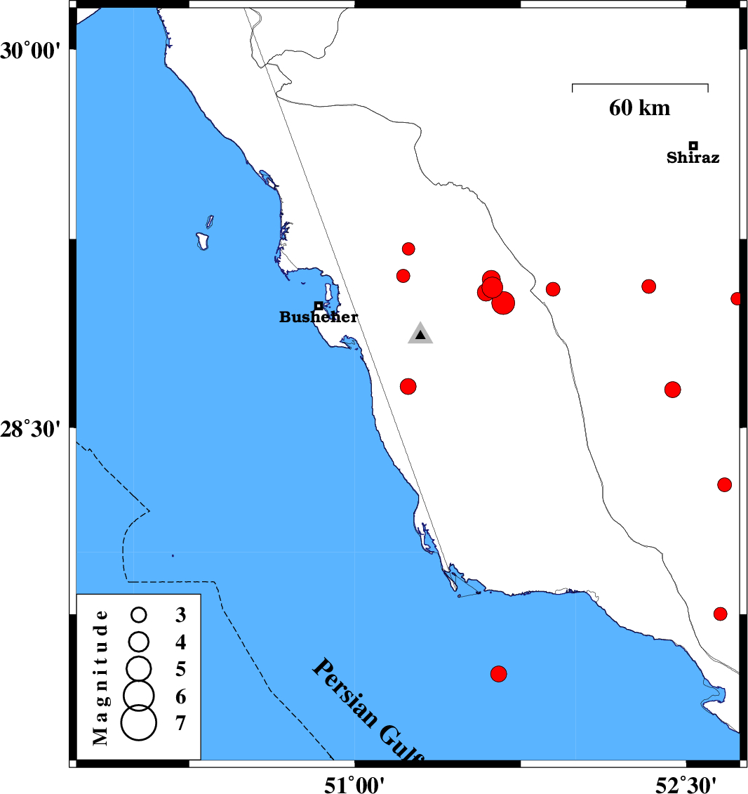 | 2017/08/19 | 11:32:42.4 | 16:02:42.4 | 29.103 | 51.219 | 15 | ML2.7 | Bushehr Province, 18 km South of Borazjan | ||