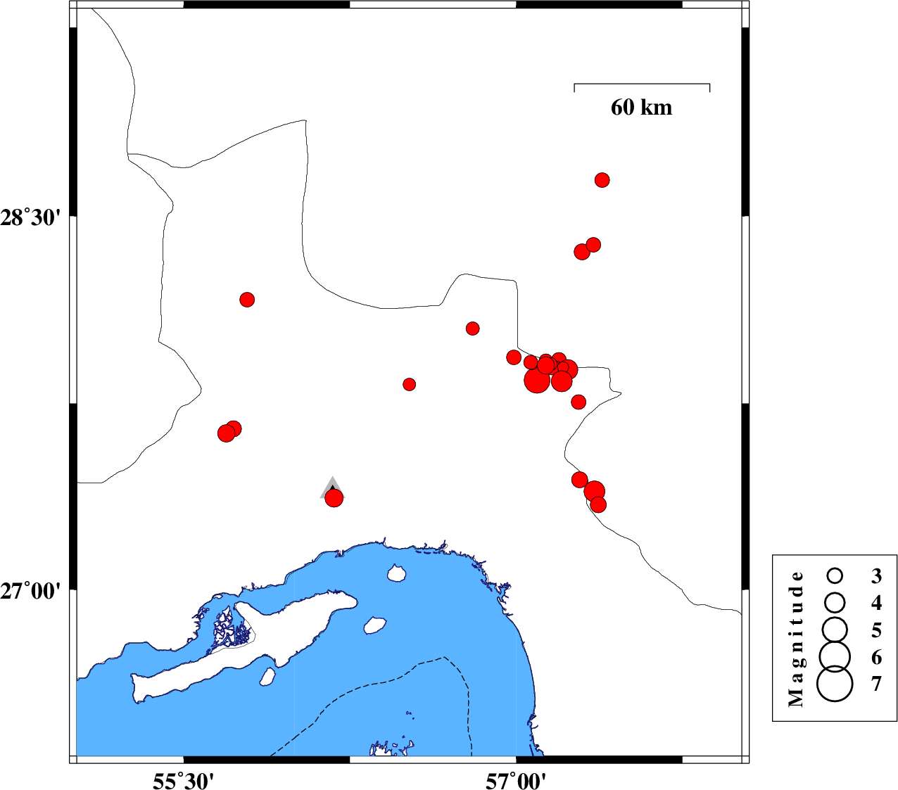 2017/08/20 | 02:08:22.2 | 06:38:22.2 | 27.444 | 57.286 | 18 | ML:3.2 | Hormozgan Province, 5 km of Dehbarez | ||