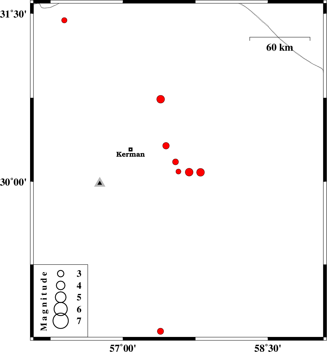| 2017/08/27 | 21:46:20.4 | 02:16:20.4 | 30.083 | 57.802 | 6 | ML3.7 | Kerman Province, 73 km South-East of Kerman | ||