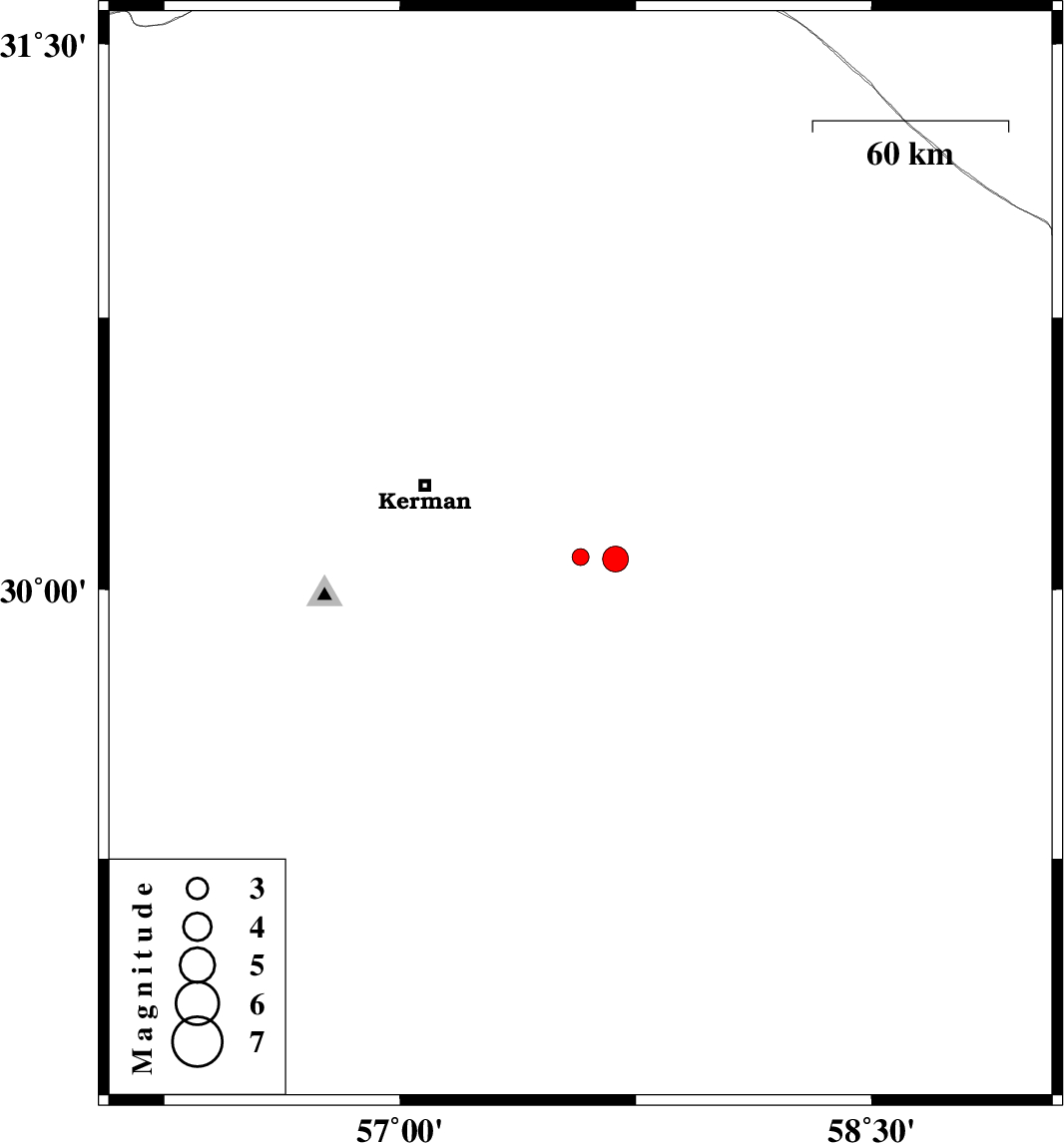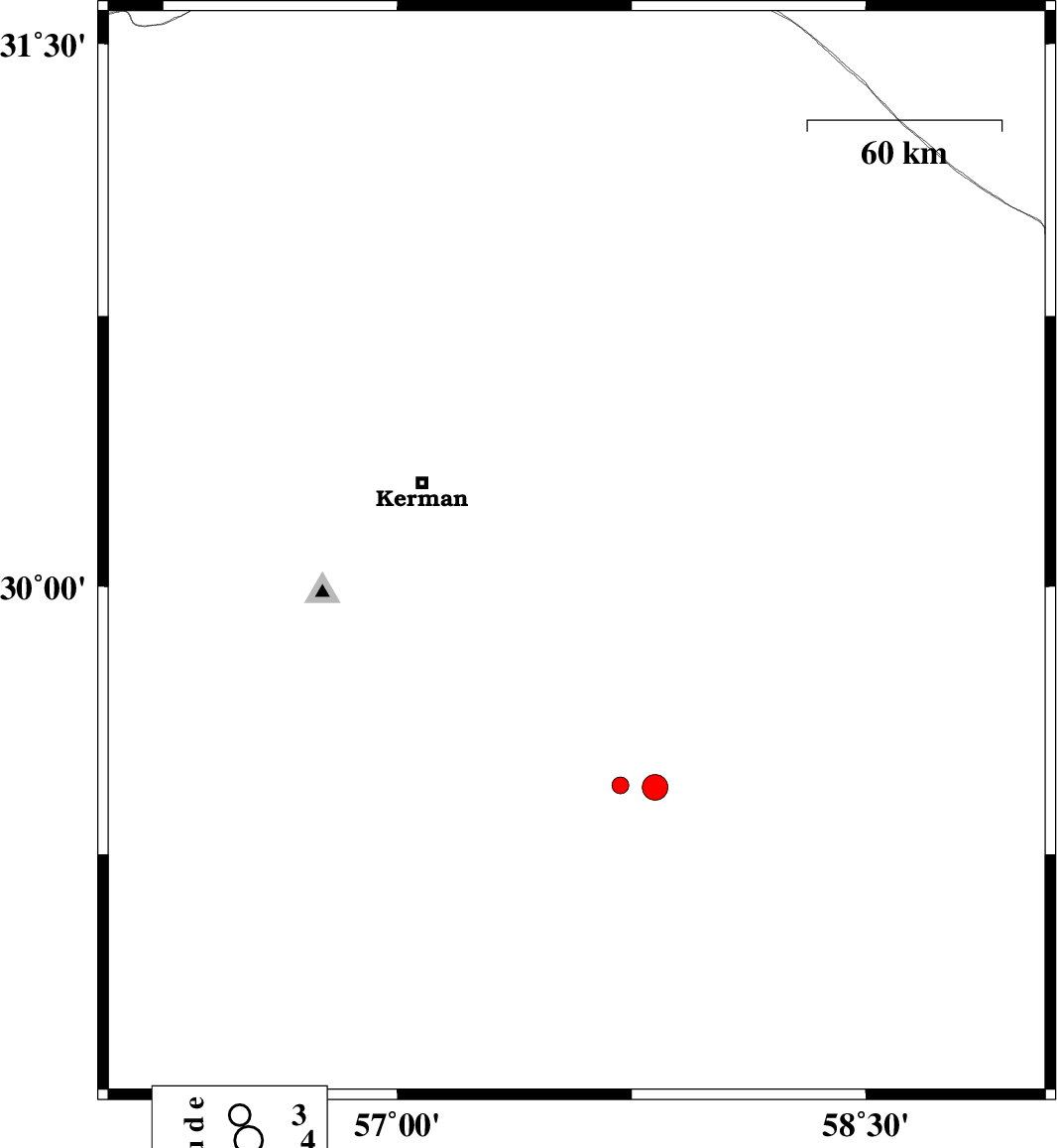 | 2017/09/10 | 23:53:51.3 | 04:23:51.3 | 30.084 | 57.685 | 6 | ML3.6 | Kerman Province, 63 km South-East of Kerman |