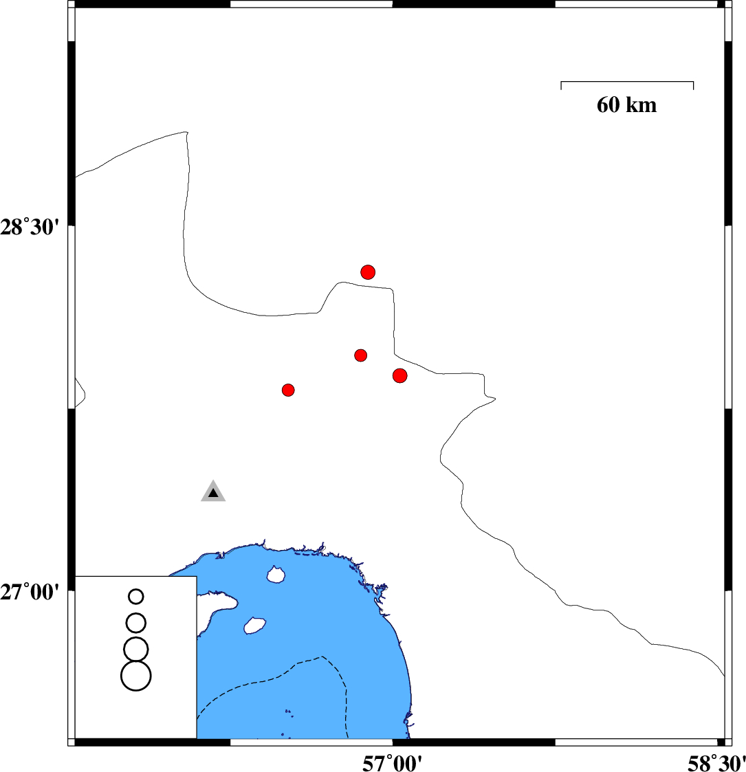 | 2017/09/17 | 22:44:17.4 | 03:14:17.4 | 27.886 | 57.033 | 14 | ML2.9 | Hormozgan Province, 55 km North-West of Dehbarez | ||