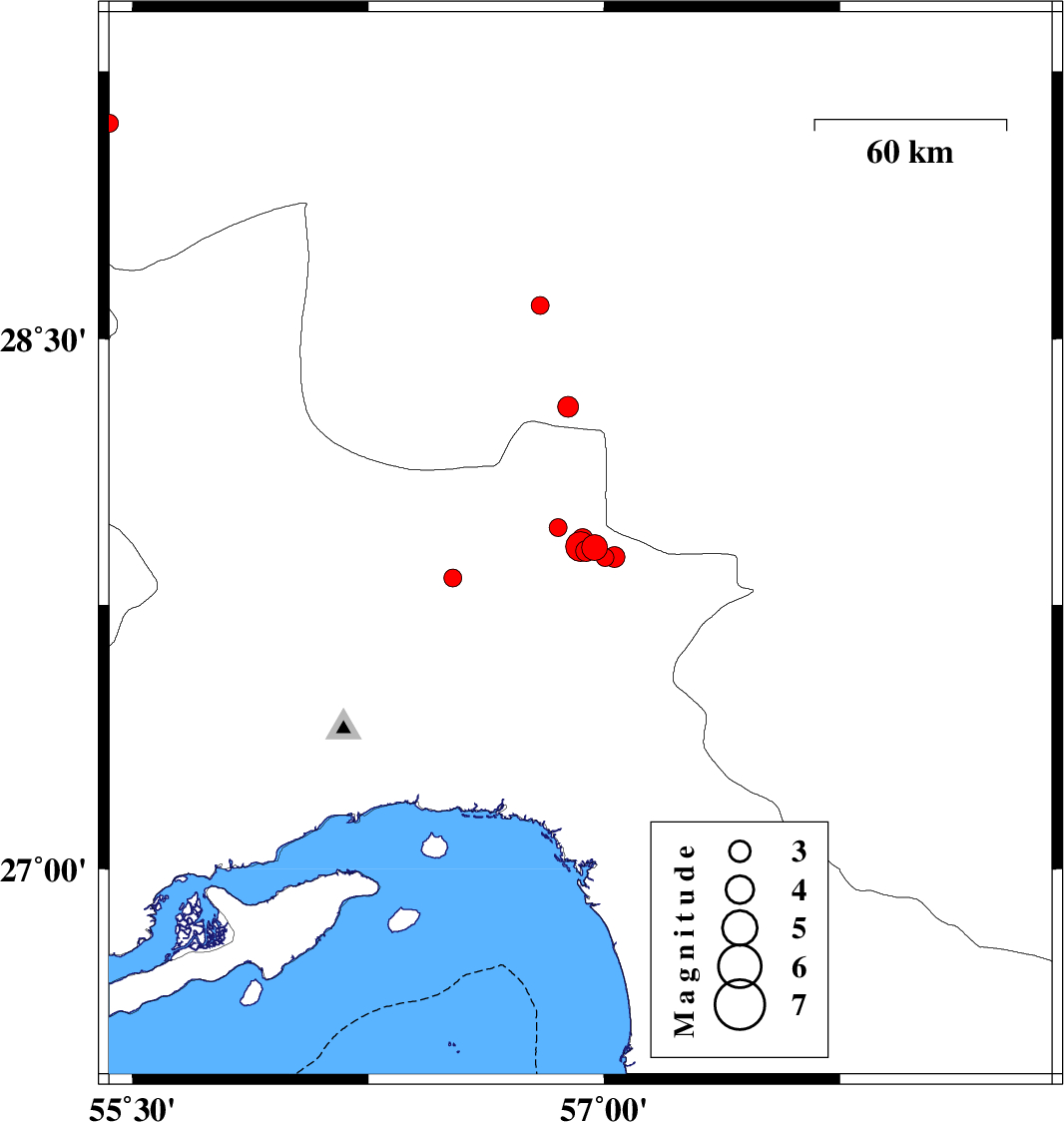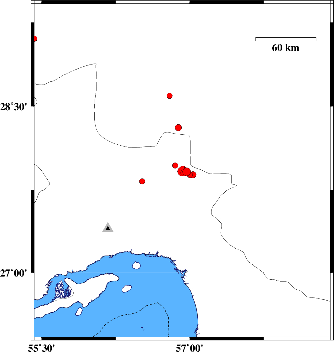 | 2017/09/20 | 16:18:13.1 | 20:48:13.1 | 27.903 | 56.943 | 14 | ML2.9 | Hormozgan Province, 60 km North-West of Dehbarez | ||