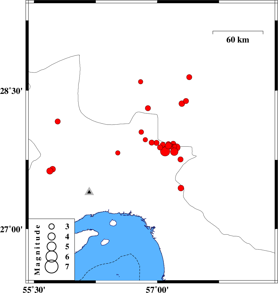 | 2017/09/17 | 22:44:17.4 | 03:14:17.4 | 27.886 | 57.033 | 14 | ML2.9 | Hormozgan Province, 55 km North-West of Dehbarez | ||