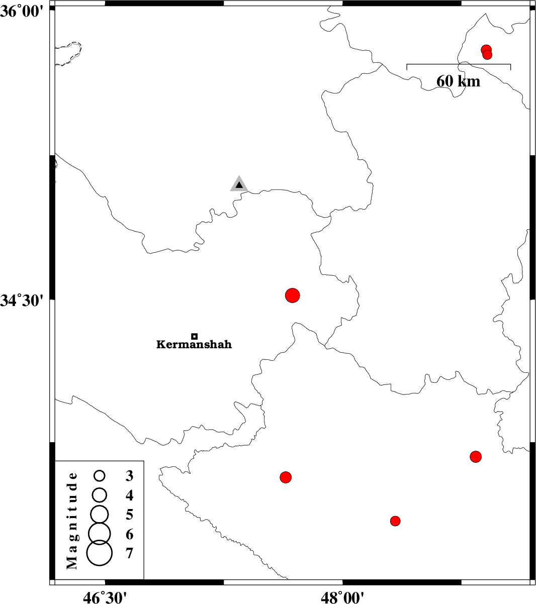 2017/09/21 | 04:59:47.7 | 09:29:47.7 | 34.521 | 47.683 | 15 | ML:4.1 | Kermanshah Province, 5 km of Sahneh | ||