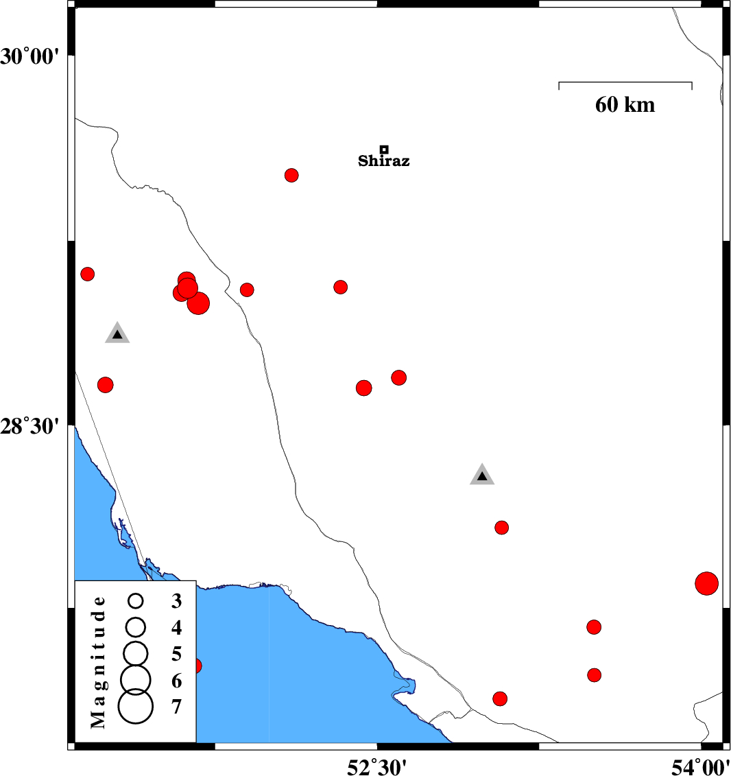 | 2017/09/04 | 02:30:11.4 | 07:00:11.4 | 28.08 | 53.076 | 10 | ML2.8 | Fars Province, 43 km South of Qir va Karzin | ||