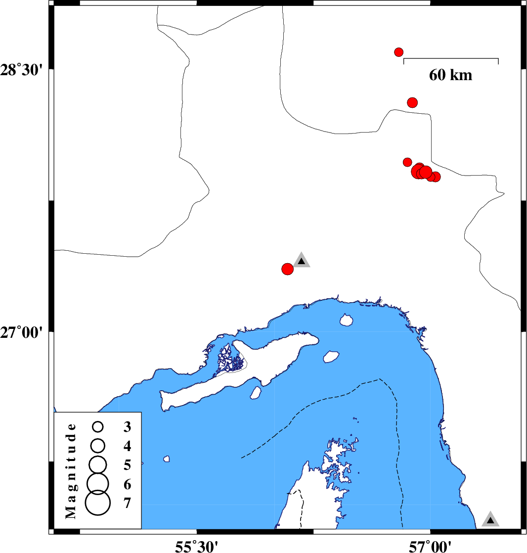 | 2017/09/20 | 16:18:13.1 | 20:48:13.1 | 27.903 | 56.943 | 14 | ML2.9 | Hormozgan Province, 60 km North-West of Dehbarez | ||