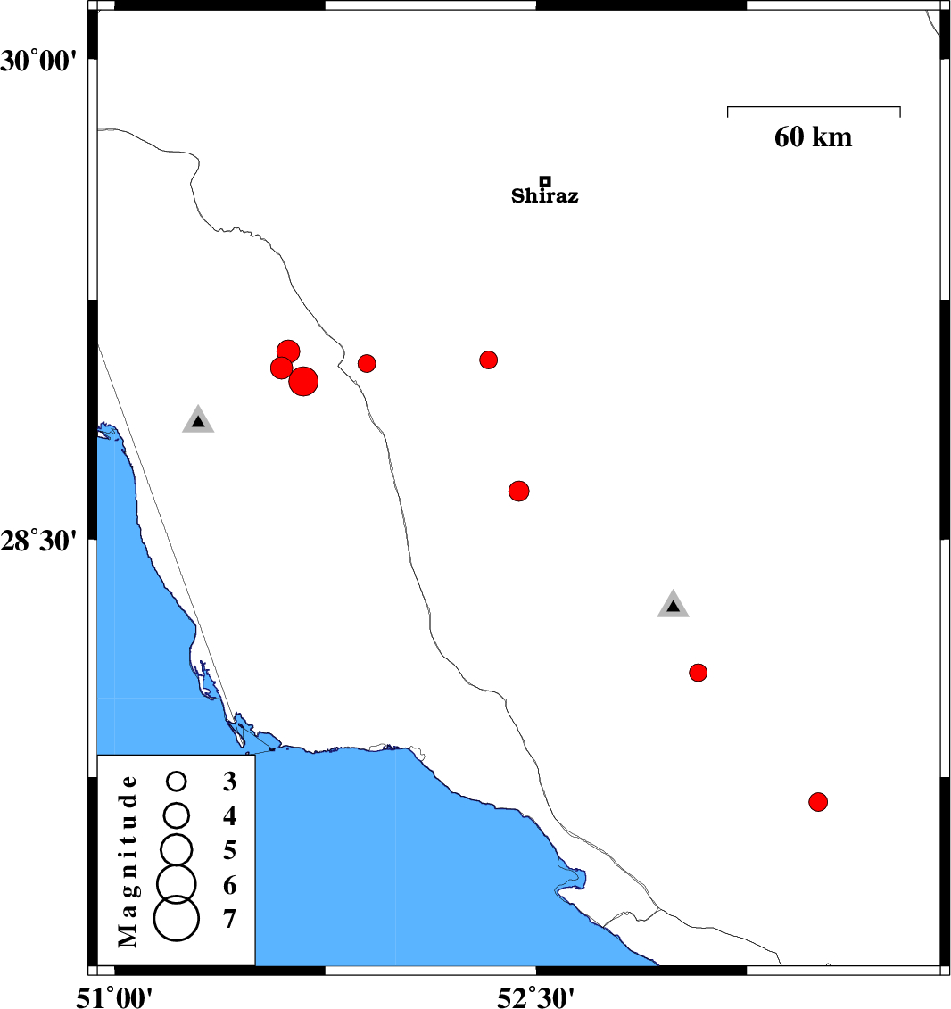 | 2017/09/06 | 10:22:35.8 | 14:52:35.8 | 29.038 | 51.593 | 16 | ML3.5 | Bushehr Province, 37 km North-East of Ahram | ||