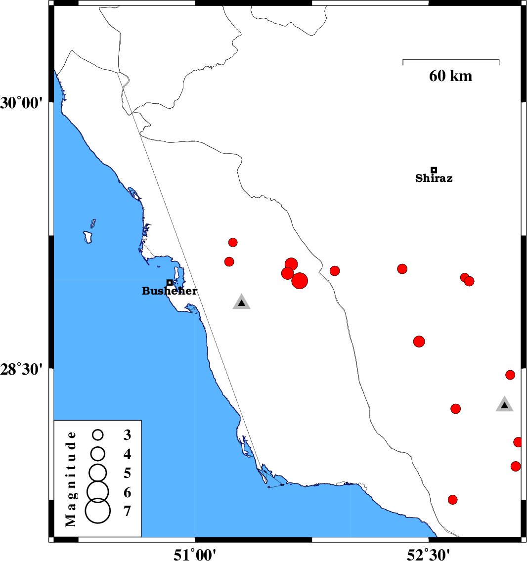 2017/09/06 | 10:22:35.8 | 14:52:35.8 | 29.038 | 51.593 | 16 | ML:3.5 | Bushehr Province, 37 km North-East of Ahram | ||