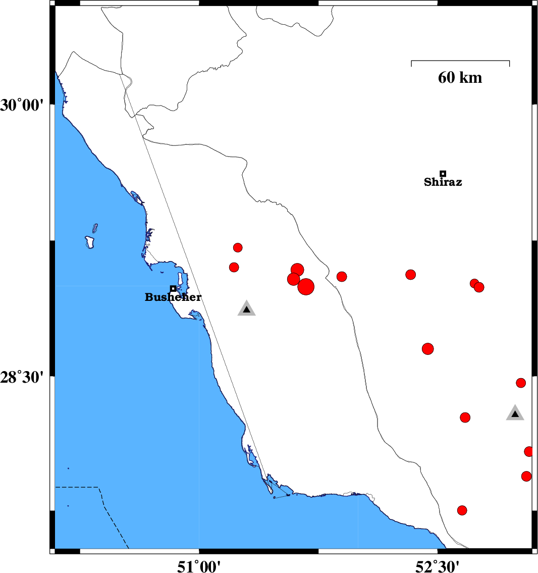 | 2017/08/19 | 11:32:42.4 | 16:02:42.4 | 29.103 | 51.219 | 15 | ML2.7 | Bushehr Province, 18 km South of Borazjan | ||