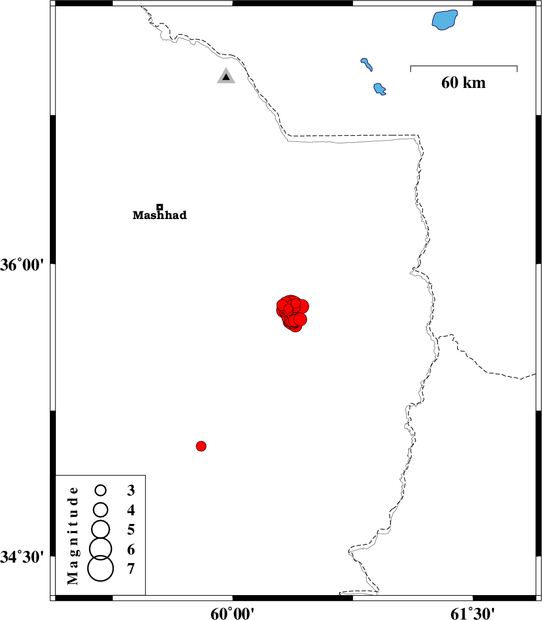 | 2017/04/08 | 04:02:43.3 | 08:32:43.3 | 35.71 | 60.391 | 15 | ML3 | Khorasan(center) Province, 49 km -East of Fariman | ||