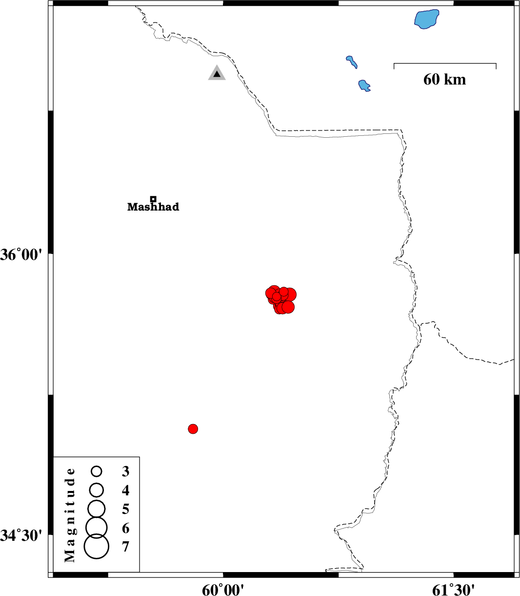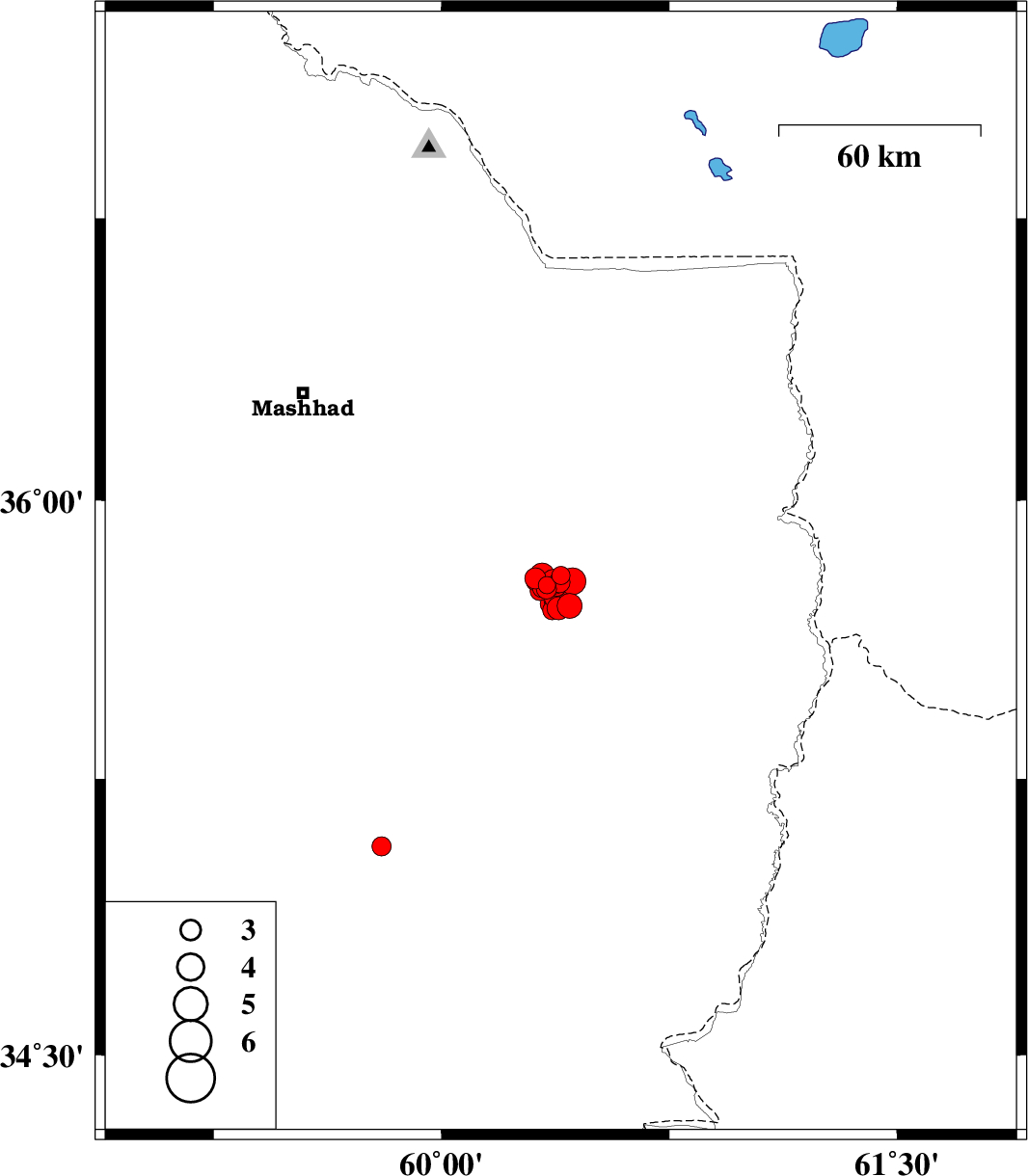 | 2017/04/08 | 04:02:43.3 | 08:32:43.3 | 35.71 | 60.391 | 15 | ML3 | Khorasan(center) Province, 49 km -East of Fariman | ||