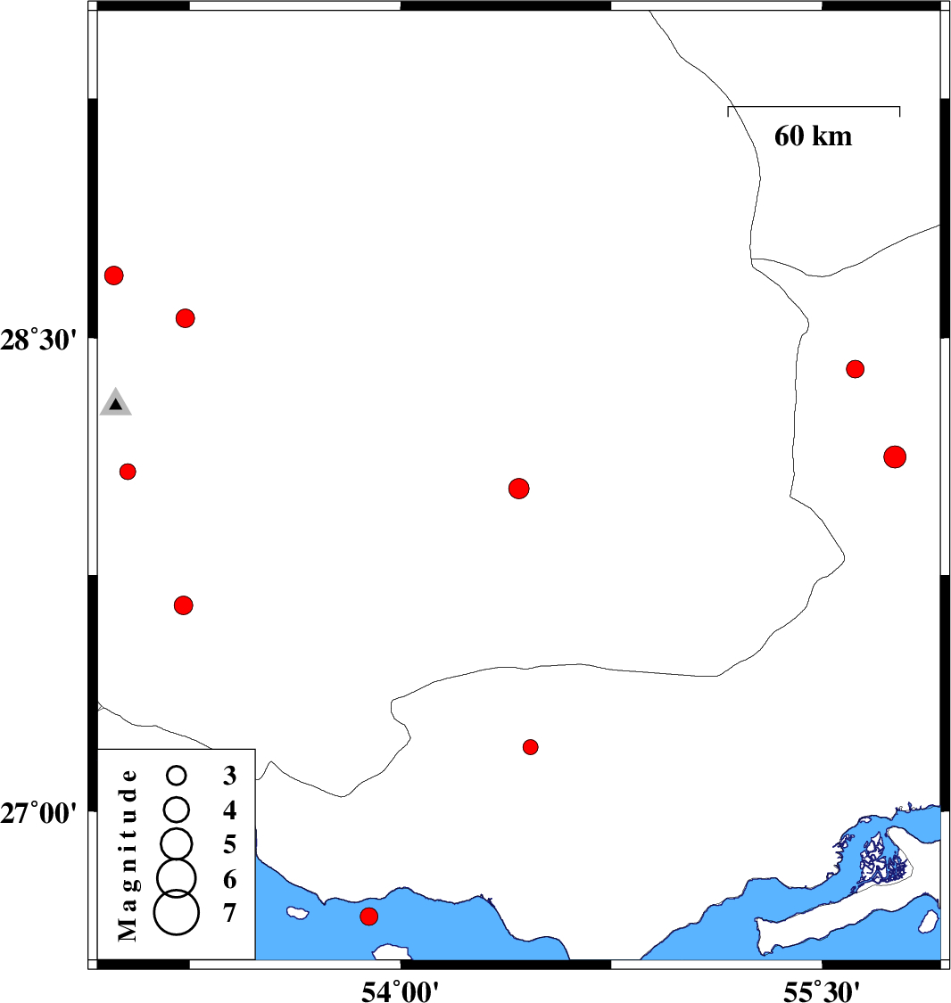 | 2017/03/05 | 14:50:23.5 | 18:20:23.5 | 26.664 | 53.888 | 14 | ML2.8 | Persian Gulf, 76 km South-West of Bastak | ||