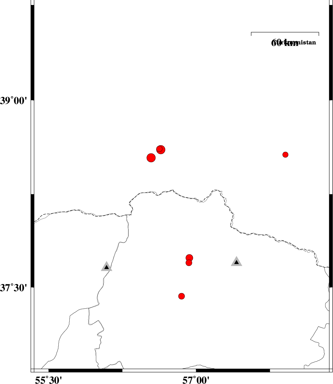 | 2017/03/09 | 04:36:51.8 | 08:06:51.8 | 37.705 | 57.348 | 6 | ML2.5 | Khorasan(north) Province, 26 km North of Bojnurd |