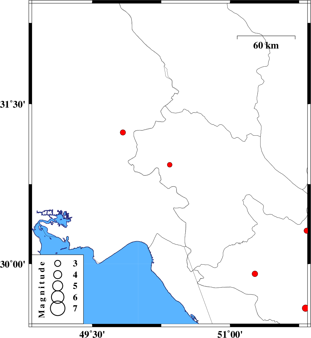 | 2017/10/02 | 06:22:28.1 | 09:52:28.1 | 29.906 | 51.269 | 14 | ML2.8 | Fars Province, 34 km South-West of Nurabad | ||