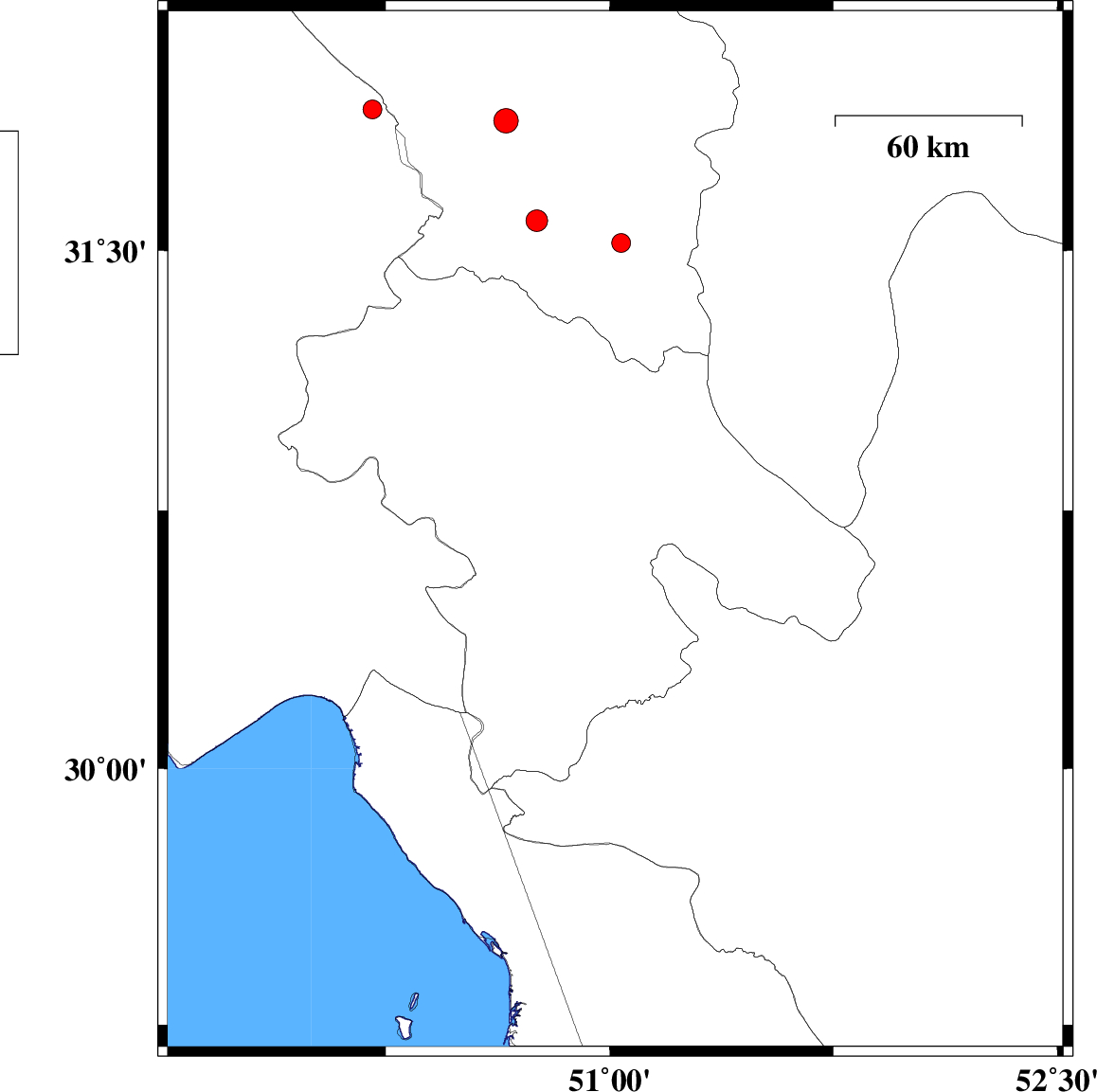 | 2017/09/16 | 05:16:21.3 | 09:46:21.3 | 29.515 | 52.103 | 14 | ML2.8 | Fars Province, 43 km South-West of Shiraz | ||