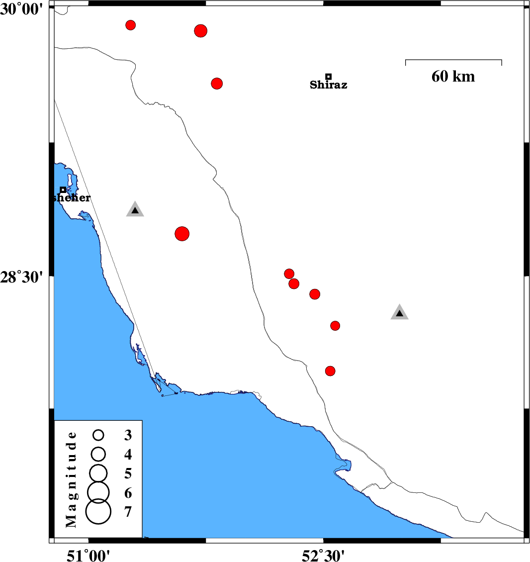 | 2017/10/02 | 06:22:28.1 | 09:52:28.1 | 29.906 | 51.269 | 14 | ML2.8 | Fars Province, 34 km South-West of Nurabad |