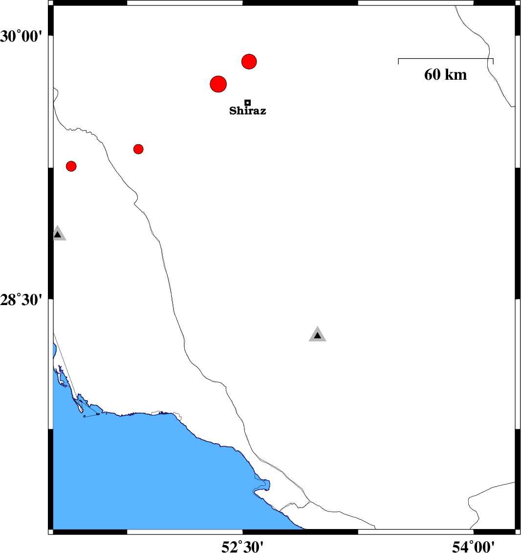 2017/09/16 | 05:16:21.3 | 09:46:21.3 | 29.515 | 52.103 | 14 | ML:2.8 | Fars Province, 43 km South-West of Shiraz | ||