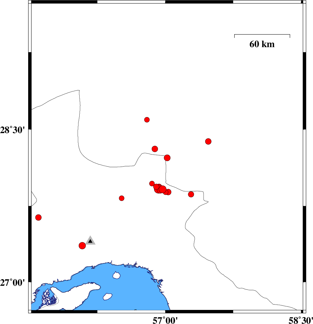 2017/10/08 | 08:47:00.9 | 12:17:00.9 | 27.636 | 55.598 | 6 | ML:3 | Hormozgan Province, 81 km South-West of Hajiabad | ||