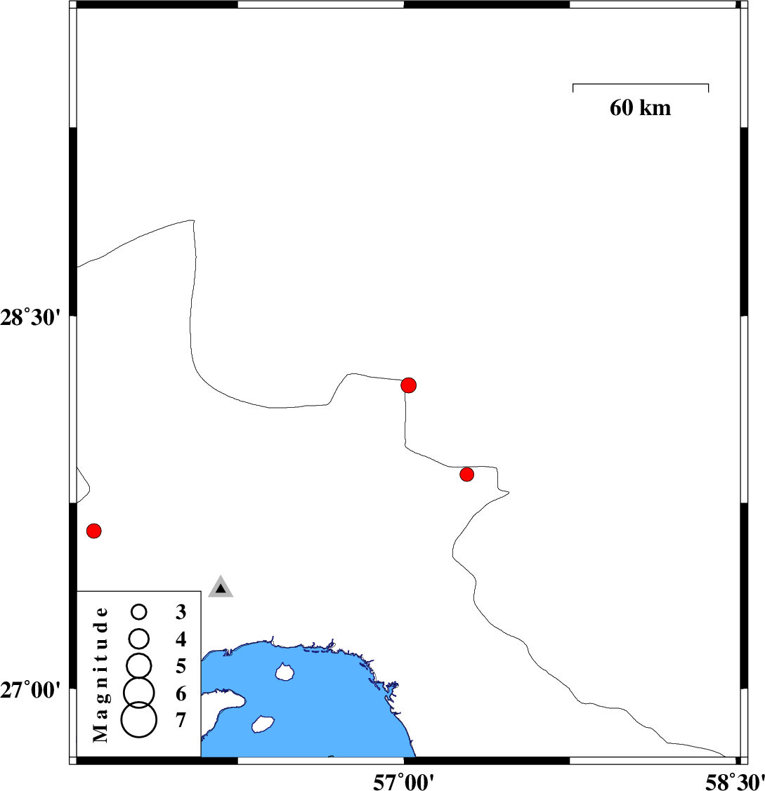 | 2017/10/05 | 16:03:29.2 | 19:33:29.2 | 27.864 | 57.285 | 14 | ML2.8 | Hormozgan Province, 49 km North of Dehbarez |