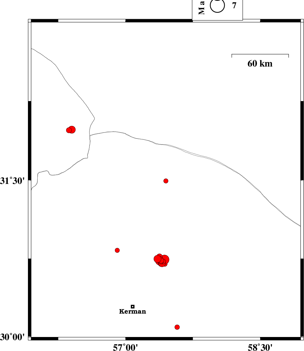 2017/10/11 | 03:58:21.4 | 07:28:21.4 | 30.747 | 57.356 | 14 | ML:3.6 | Kerman Province, 58 km North-East of Kerman | ||