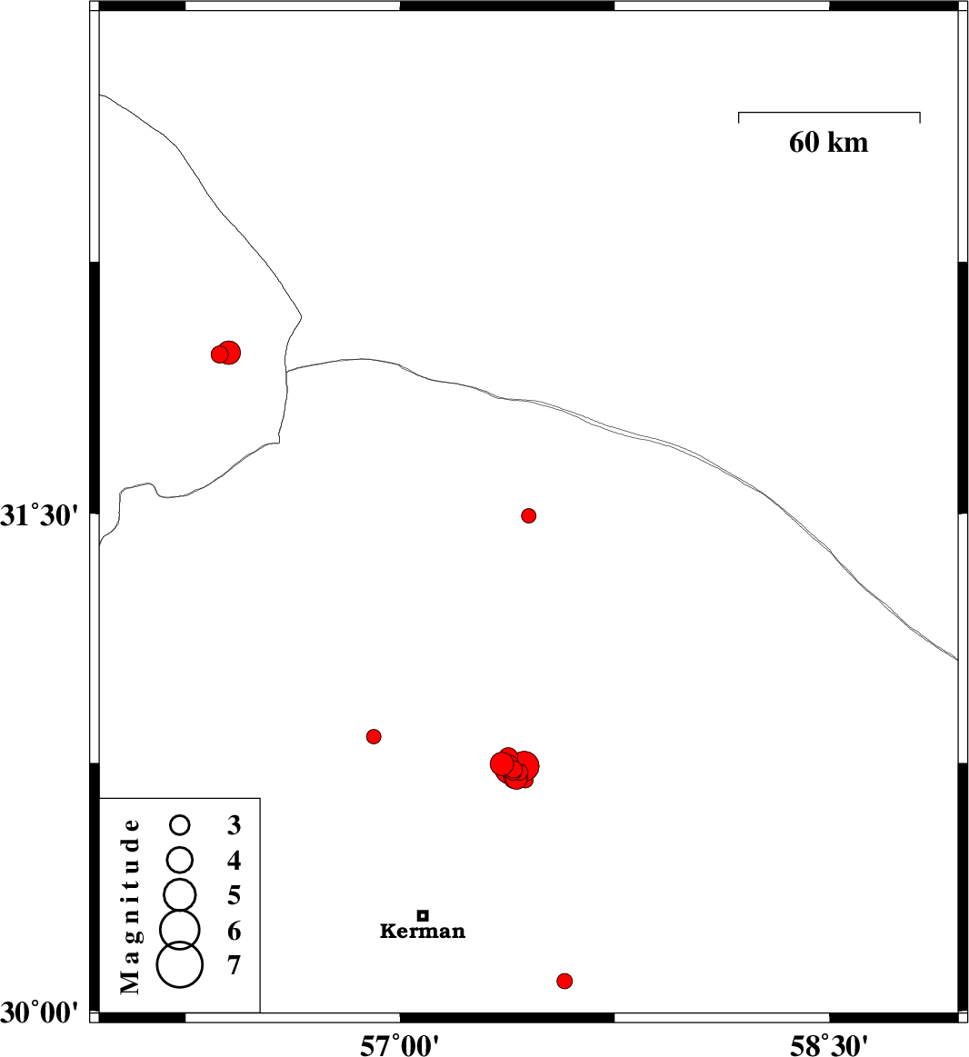 | 2017/09/21 | 19:28:38.9 | 23:58:38.9 | 30.741 | 57.434 | 7 | ML4.6 | Kerman Province, 61 km North-East of Kerman | ||