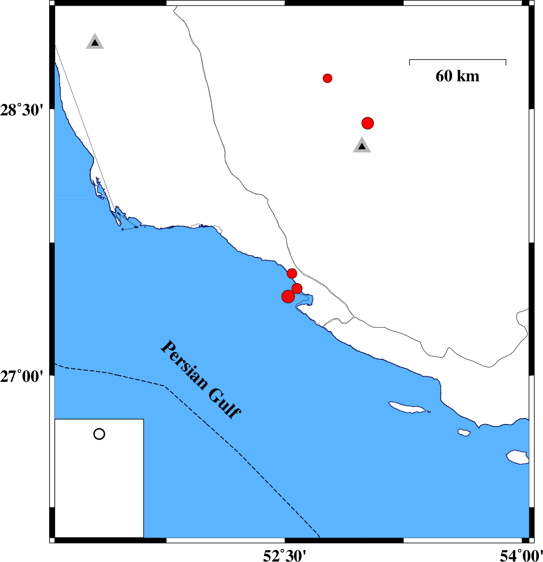 | 2017/10/14 | 18:11:51.3 | 21:41:51.3 | 27.491 | 52.576 | 15 | ML2.9 | Persian Gulf, 31 km -West of Mehr | ||