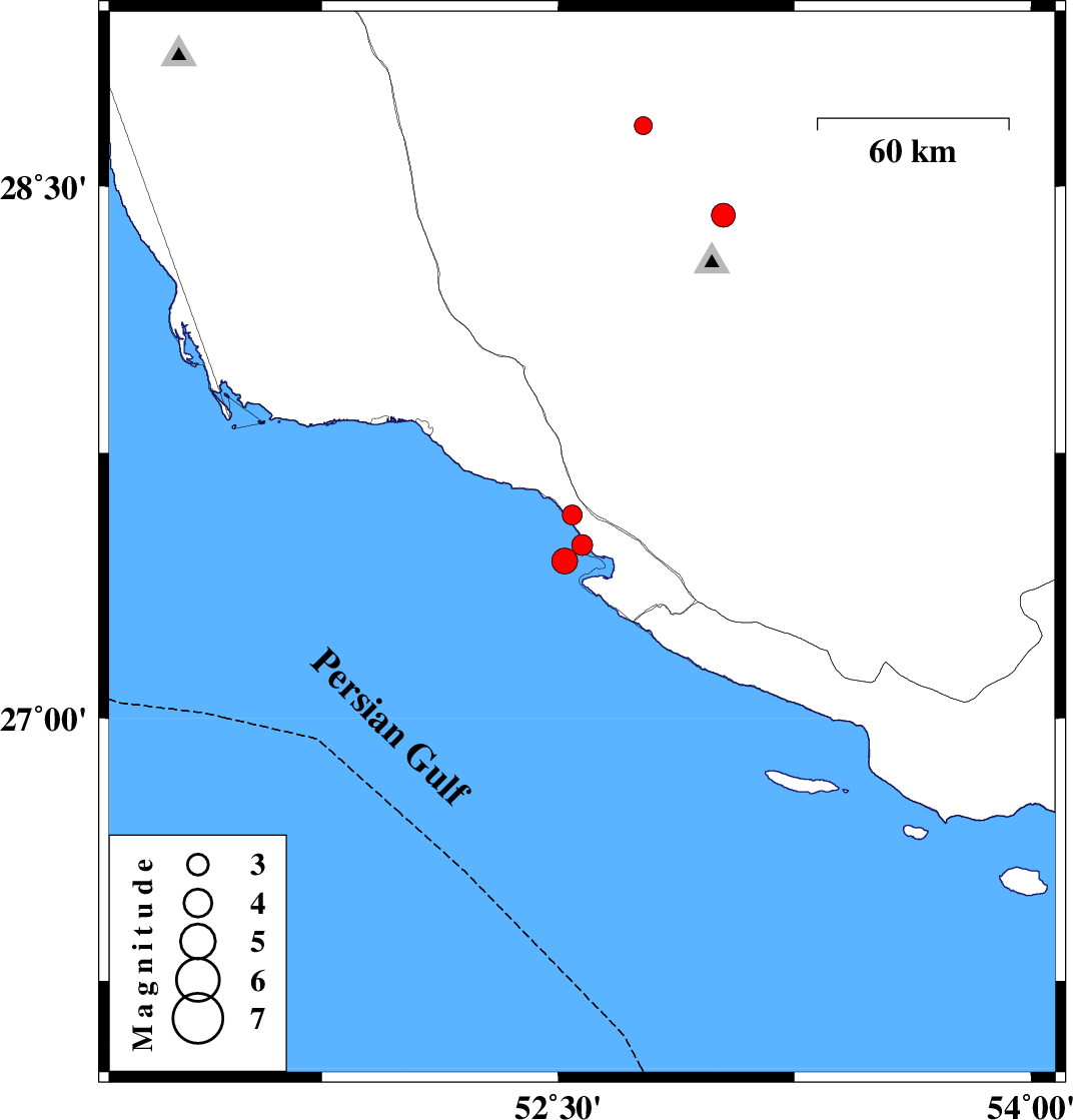 | 2017/10/14 | 18:11:51.3 | 21:41:51.3 | 27.491 | 52.576 | 15 | ML2.9 | Persian Gulf, 31 km -West of Mehr | ||