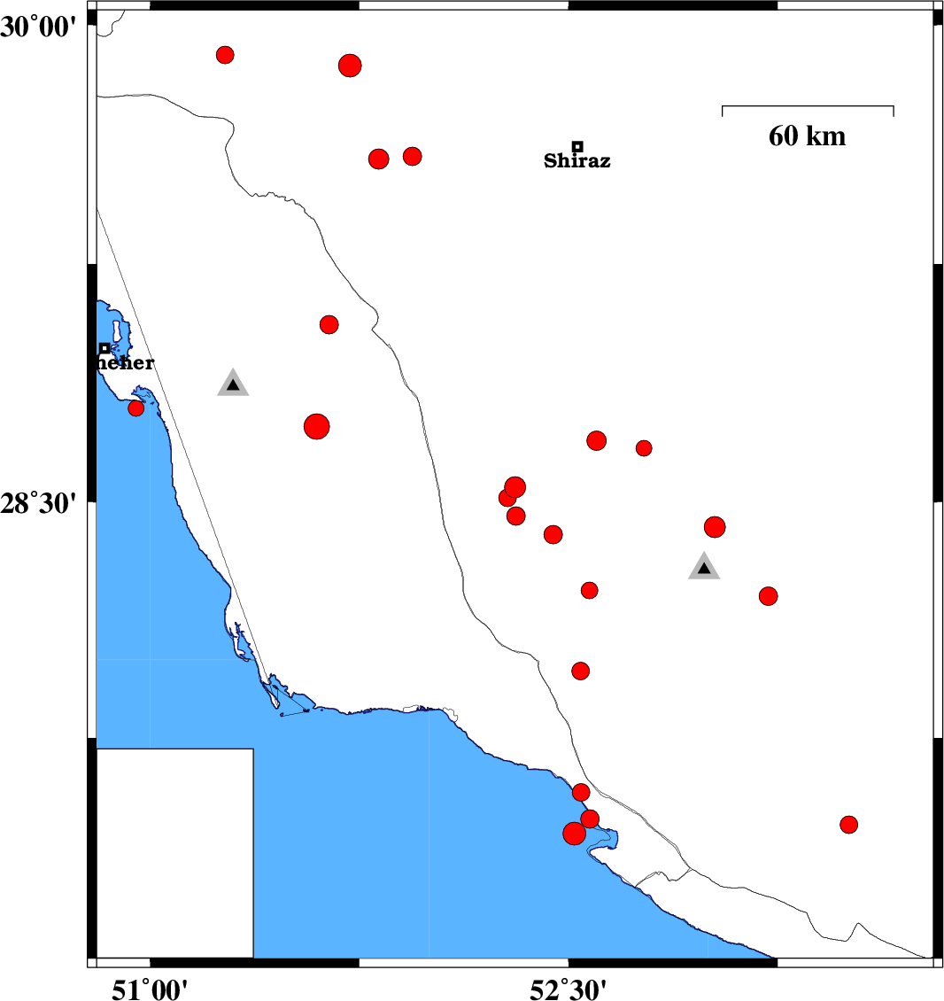 2017/10/02 | 10:11:04.6 | 13:41:04.6 | 29.58 | 51.82 | 14 | ML:3.2 | Fars Province, 17 km -East of Kazerun | ||