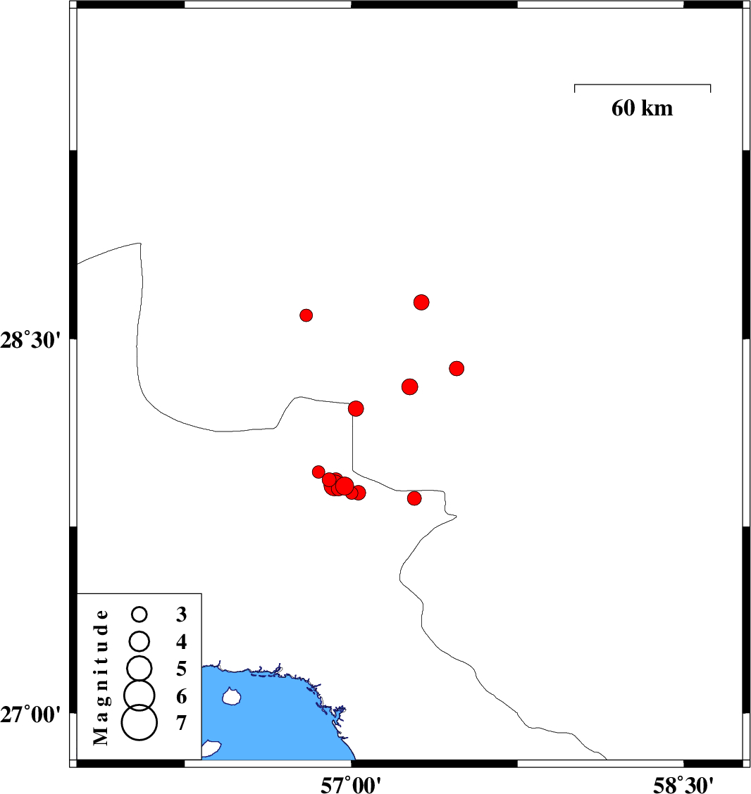 | 2017/09/17 | 22:44:17.4 | 03:14:17.4 | 27.886 | 57.033 | 14 | ML2.9 | Hormozgan Province, 55 km North-West of Dehbarez | ||