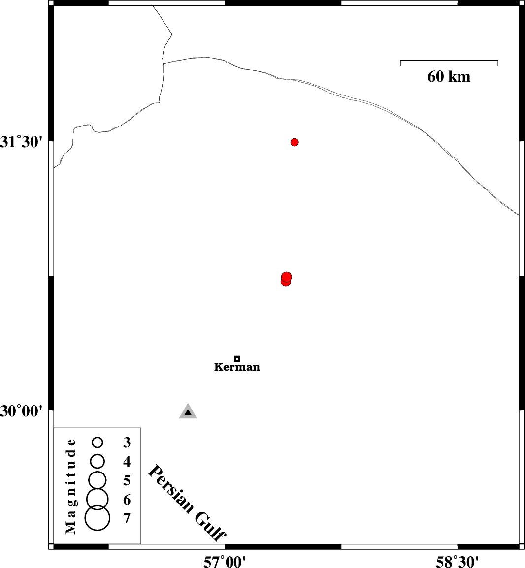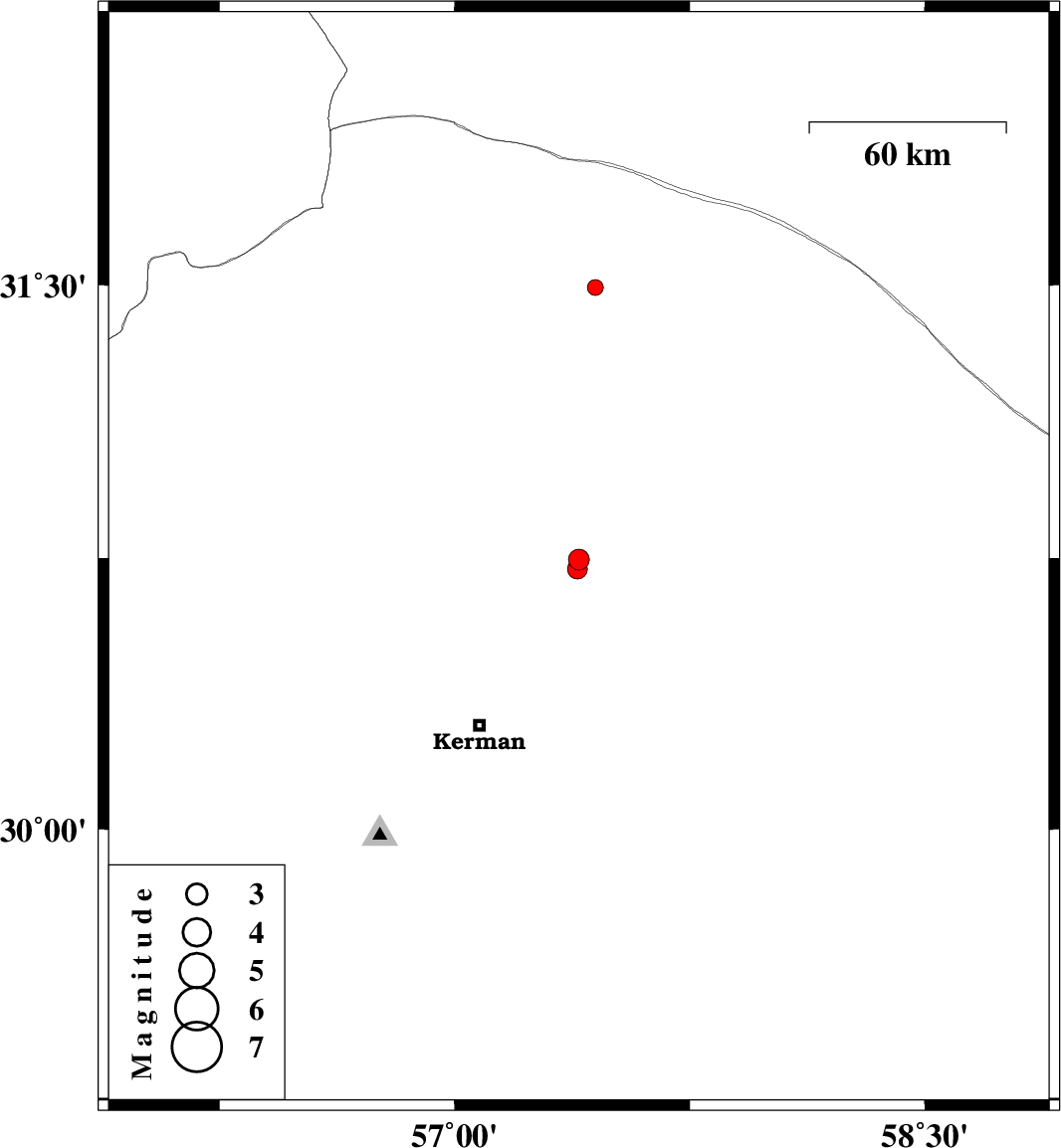 | 2017/10/13 | 06:45:54.7 | 10:15:54.7 | 31.493 | 57.449 | 14 | ML2.3 | Kerman Province, 66 km North-East of Ravar |