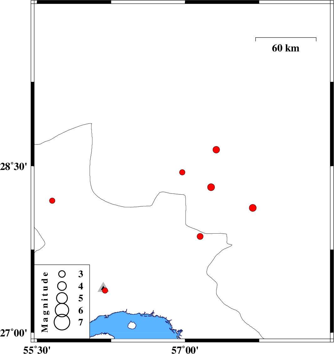 | 2017/10/14 | 08:17:13.4 | 11:47:13.4 | 27.38 | 56.188 | 10 | ML2.6 | Hormozgan Province, 24 km North of Bandar-e abbas |