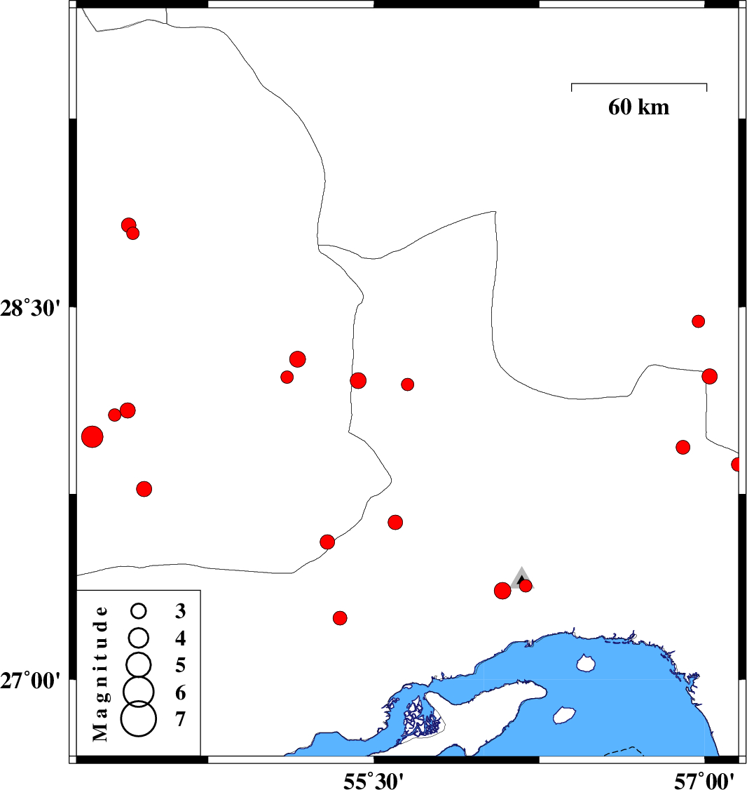 | 2017/10/15 | 05:45:42.0 | 09:15:42.0 | 27.557 | 55.289 | 18 | ML3 | Fars Province, 95 km South-East of Lar | ||