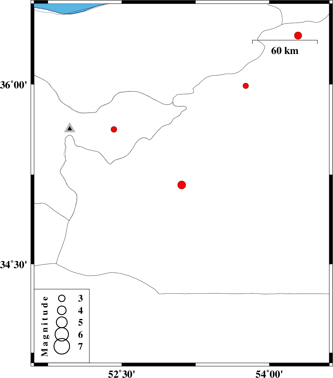 | 2017/09/23 | 00:22:18.7 | 03:52:18.7 | 36.402 | 54.292 | 15 | ML3.4 | Semnan Province, 27 km North of Damghan |