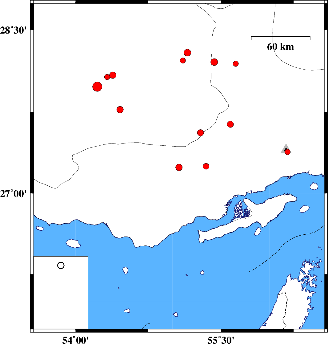 | 2017/10/15 | 05:45:42.0 | 09:15:42.0 | 27.557 | 55.289 | 18 | ML3 | Fars Province, 95 km South-East of Lar | ||