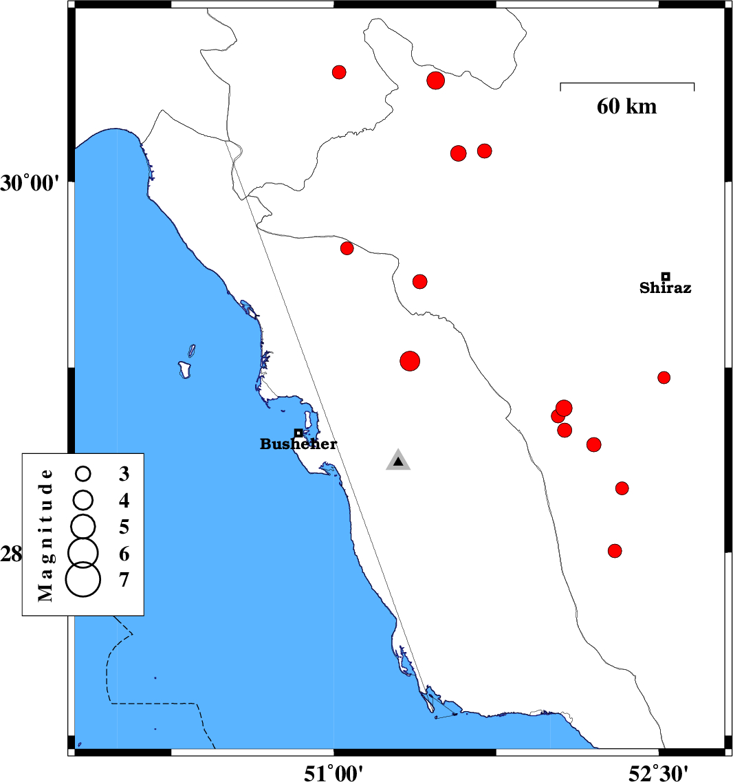 | 2017/10/22 | 04:51:30.8 | 08:21:30.8 | 29.196 | 51.305 | 16 | ML2.7 | Bushehr Province, 12 km of Borazjan | ||