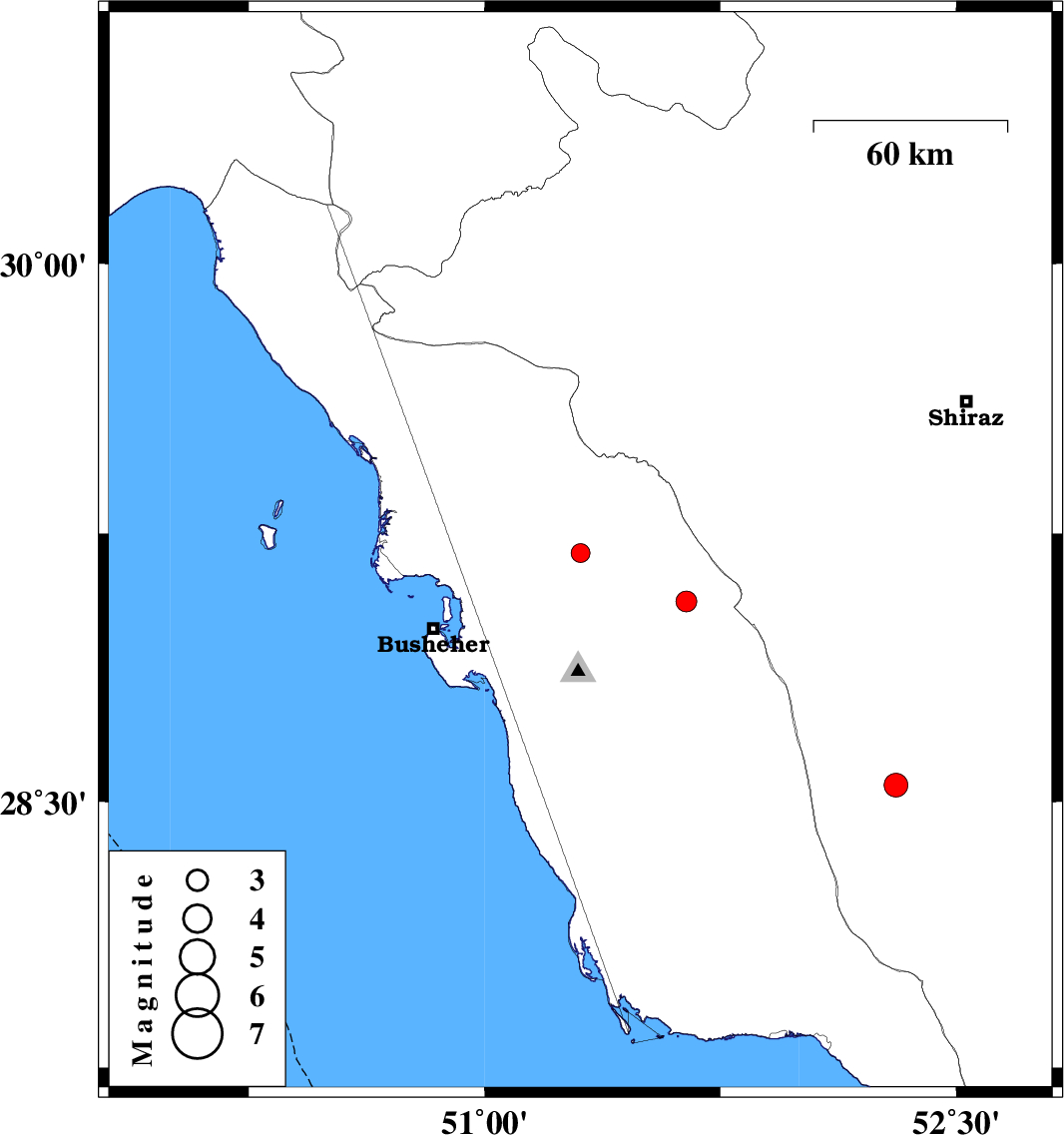 | 2017/10/16 | 09:12:52.9 | 12:42:52.9 | 29.06 | 51.642 | 14 | ML3 | Bushehr Province, 42 km North-East of Ahram |