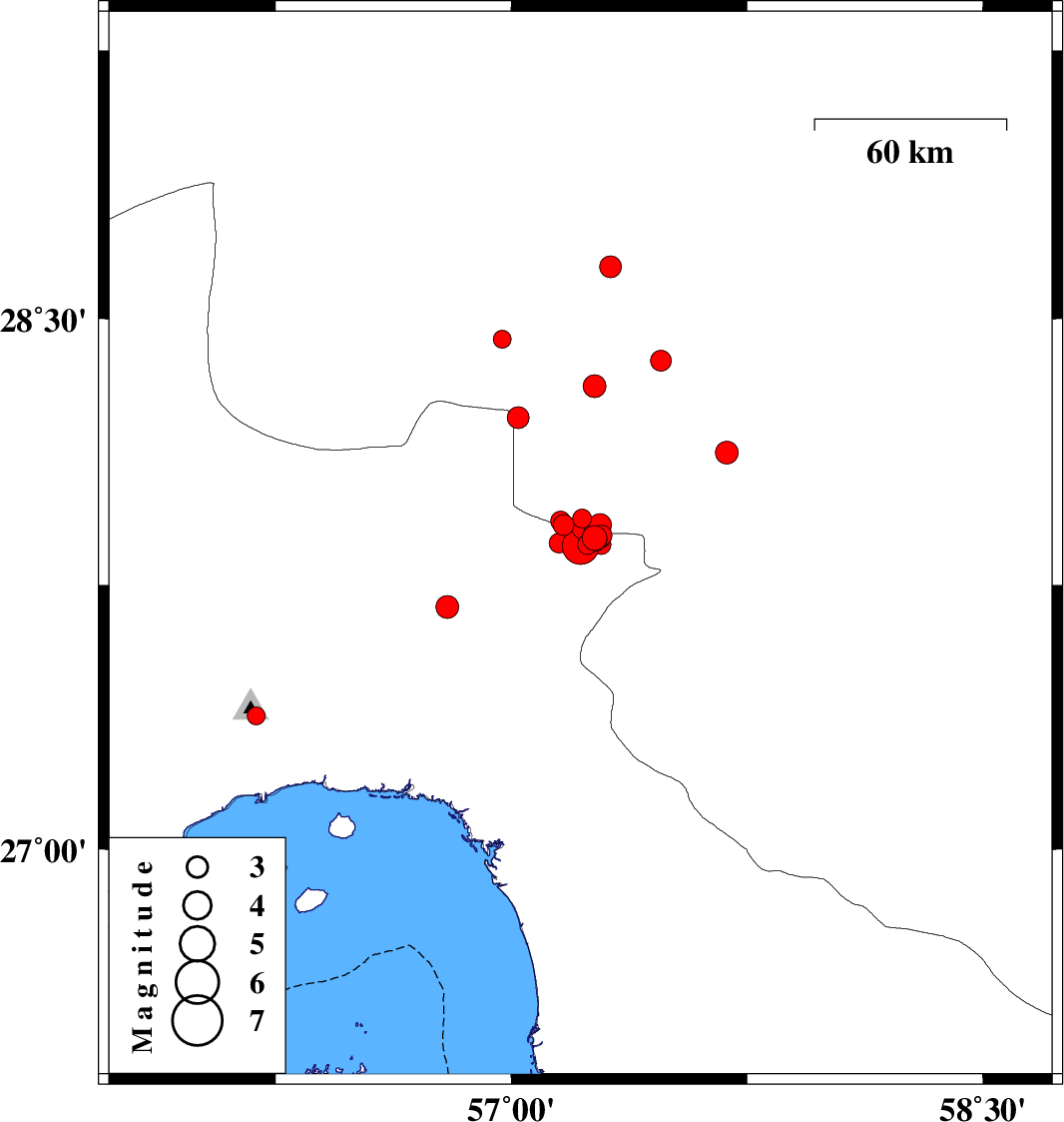 2017/10/23 | 02:05:37.9 | 05:35:37.9 | 27.93 | 57.157 | 14 | ML2.8 | Kerman Province, 53 km -West of Kahnuj | ||