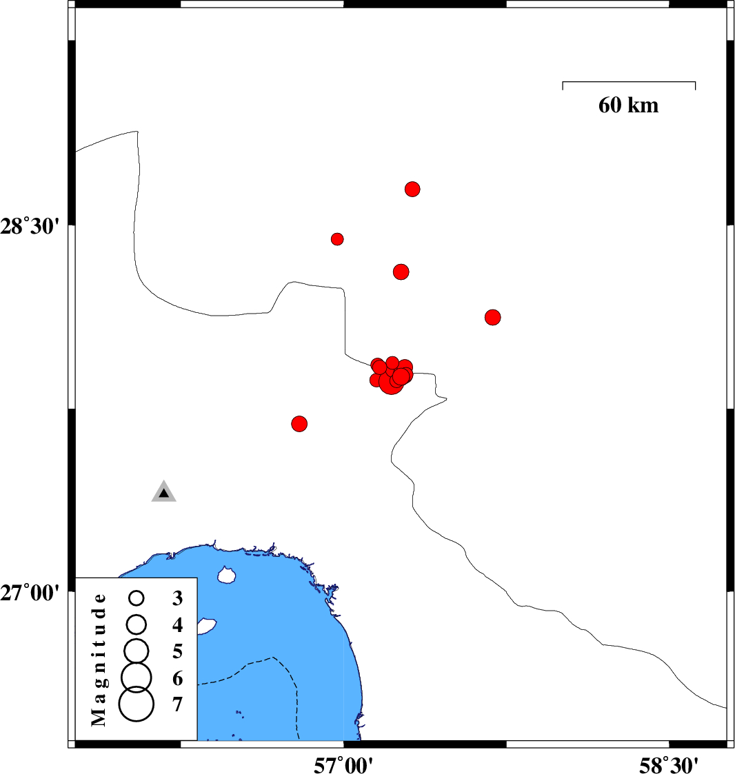 2017/10/23 | 01:56:14.1 | 05:26:14.1 | 27.898 | 57.266 | 14 | ML:3.3 | Kerman Province, 42 km -West of Kahnuj | ||