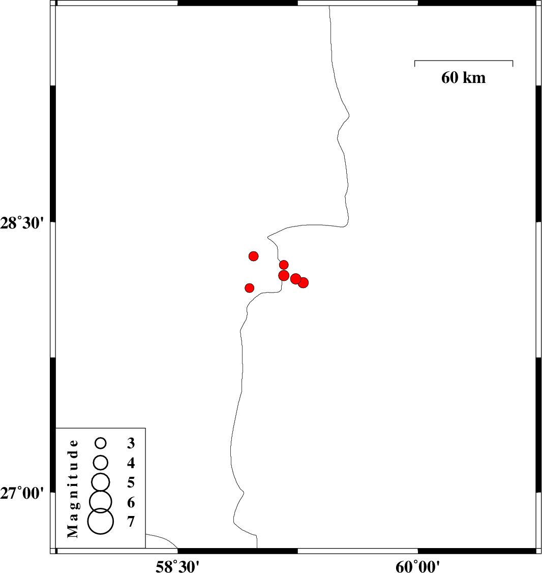 | 2017/10/04 | 08:24:46.3 | 11:54:46.3 | 28.135 | 58.949 | 14 | ML2.5 | Kerman Province, 125 km North-East of Kahnuj | ||