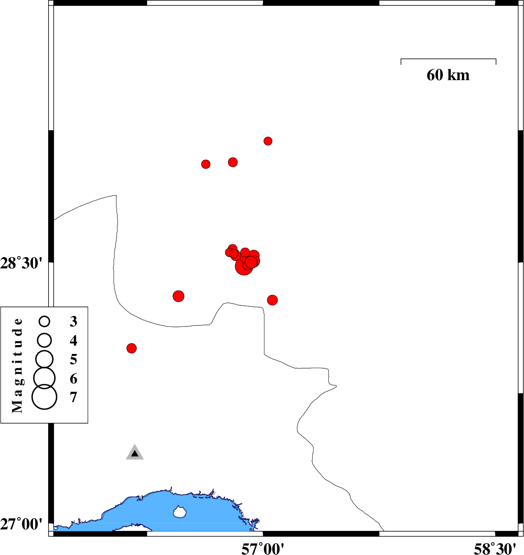 | 2017/10/28 | 02:31:02.4 | 06:01:02.4 | 28.455 | 57.147 | 6 | ML2.7 | Kerman Province, 63 km South-West of Jiroft | ||